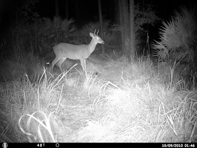 About 8:35 am. I heard the unmistakable sound of a deer pushing thru the palmettos and thick coming from the North out of Rattle snake flats. I spun around and got the camera pointed there just as he broke into the edge of the old chop. In my haste to get everything ready I forgot to punch the record button on the camera, not that there ended up being much to film.